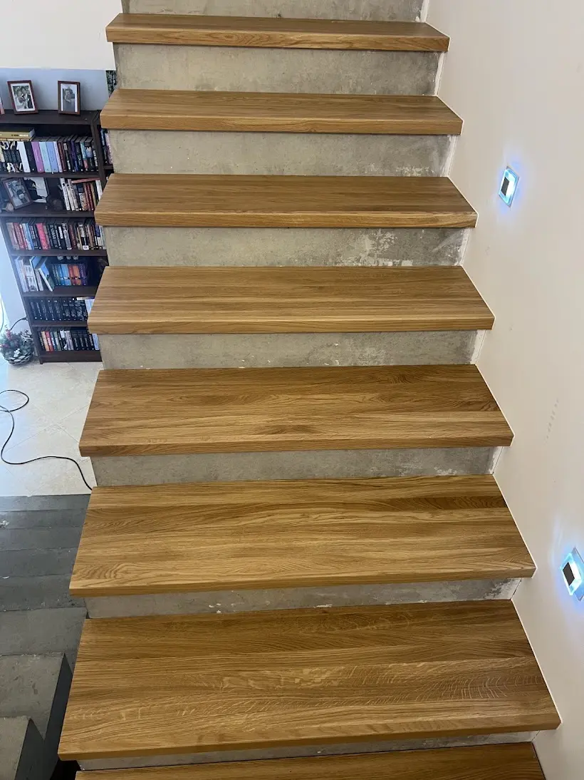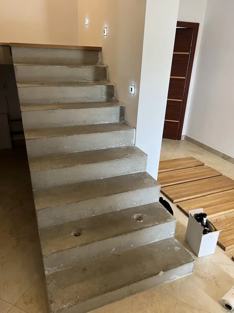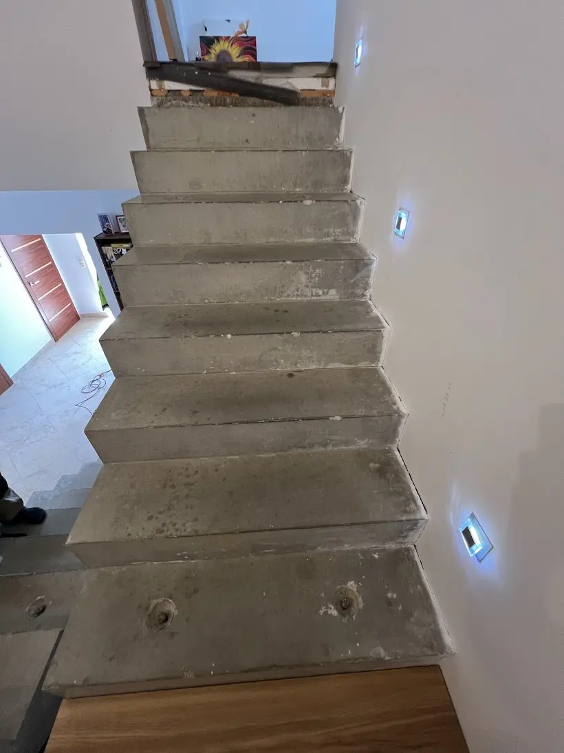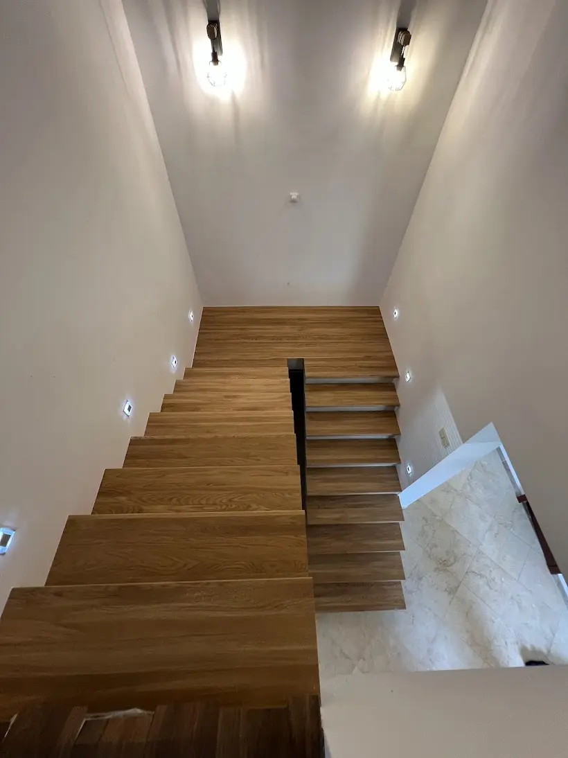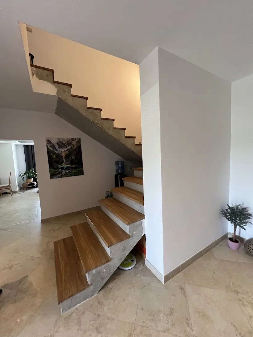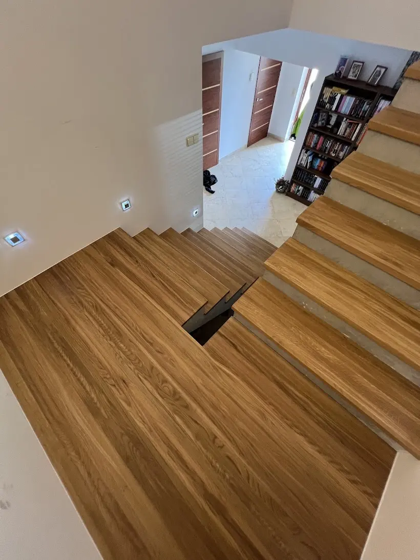 Někdy stačí jeden materiál a správné řemeslo, aby se z funkčního prvku stal skutečný střed pozornosti celého domu. Přesně to se podařilo na tomto projektu v Brně, kde jsme kompletně oblékli betonové dvouramenné schodiště do masivního dubového dřeva. Fotografie z průběhu prací ukazují, jak schodiště vypadalo před realizací – holý beton, hrubý povrch, nulový estetický dojem. Zákazník přesto viděl potenciál a rozhodl se investovat do obložení dubovými nášlapy, které celý prostor proměnily k nepoznání. Výsledek mluví sám za sebe: teplá zlatohnědá kresba dubu v kontrastu s bílými stěnami a designovými nástěnnými svítidly vytváří interiér, který působí vzdušně, moderně a přitom velmi útulně. Dubové nášlapy byly osazeny na obě ramena schodiště včetně mezipodesty, která plynule navazuje na stejný materiál a vytváří tak dokonale jednotný celek. Právě tato návaznost – kdy nášlapy, podesta i okolní podlaha ladí v jednom dřevěném tónu – je to, co z obložení schodiště dělá skutečně profesionální výsledek a ne jen dodatečnou opravu. Obložení schodiště v Brně a okolí patří k našim nejčastějším zakázkám. Betonové schodiště je ideálním základem pro dubové nášlapy – je pevné, stabilní a dřevo na něm drží spolehlivě po celá léta. Pokud řešíte podobnou proměnu ve svém domě, neváhejte nás kontaktovat – rádi vám připravíme nezávaznou nabídku přímo na míru.
